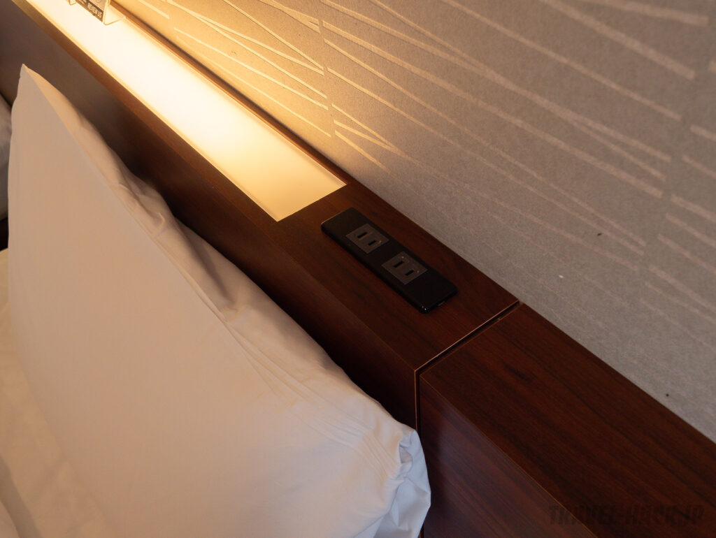 ヘッドボード上には小物を置けそうな感じになっており、そこにコンセントやスイッチがありますが、こちらが少し使いにくく…