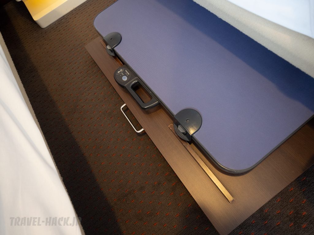 ベッド周りにコンセントはありません。携帯の充電をすることができない…と思ったら、サイドテーブルに携帯電話充電器と書かれたところの中に充電器が入っていました。