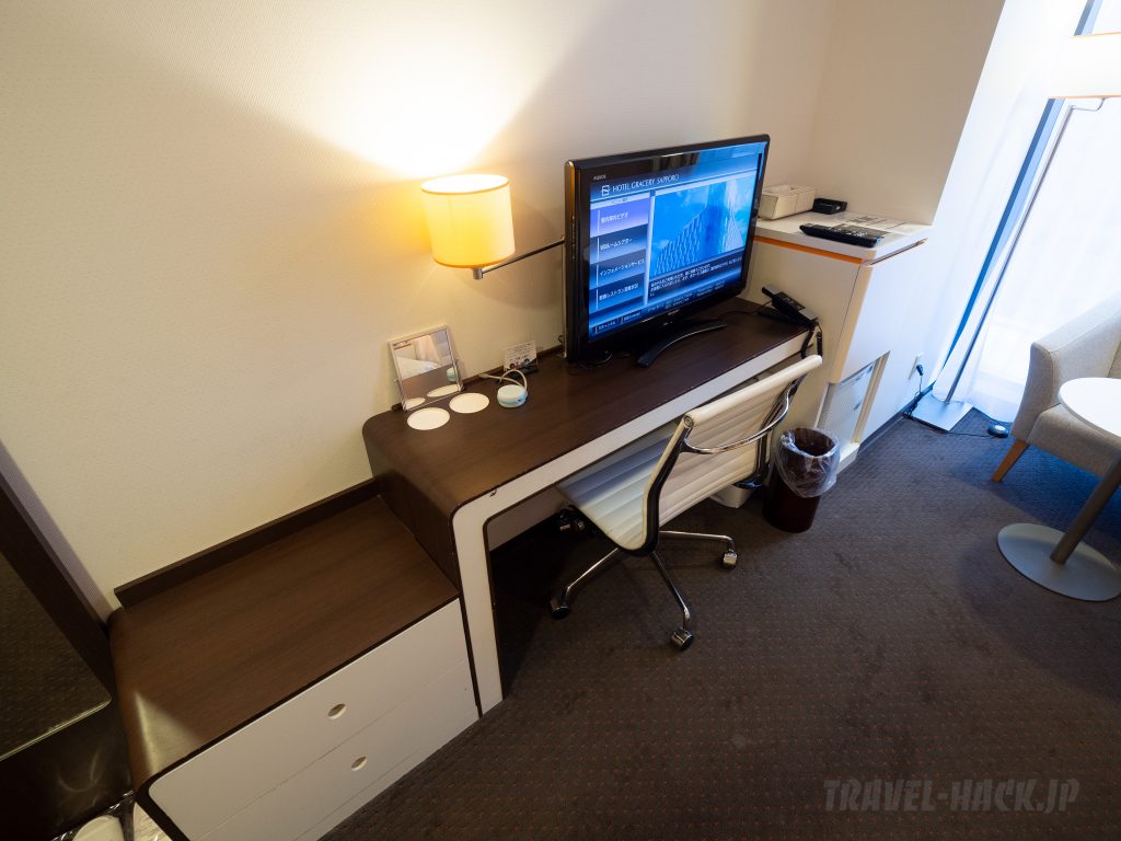 デスクは非常に狭く、使い勝手はかなり悪かったです。テレビがデスクの半分を占めています…