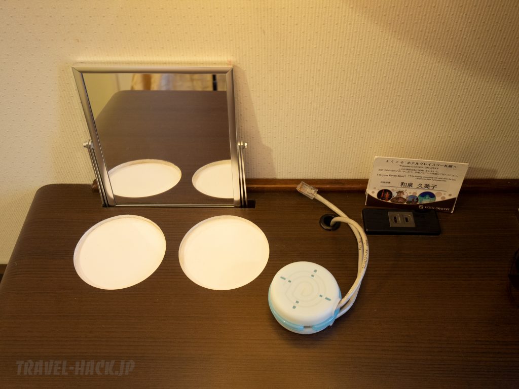 鏡や有線LAN、コンセントx1口など。コンセントは2口ぐらいあればよかったかなと…
