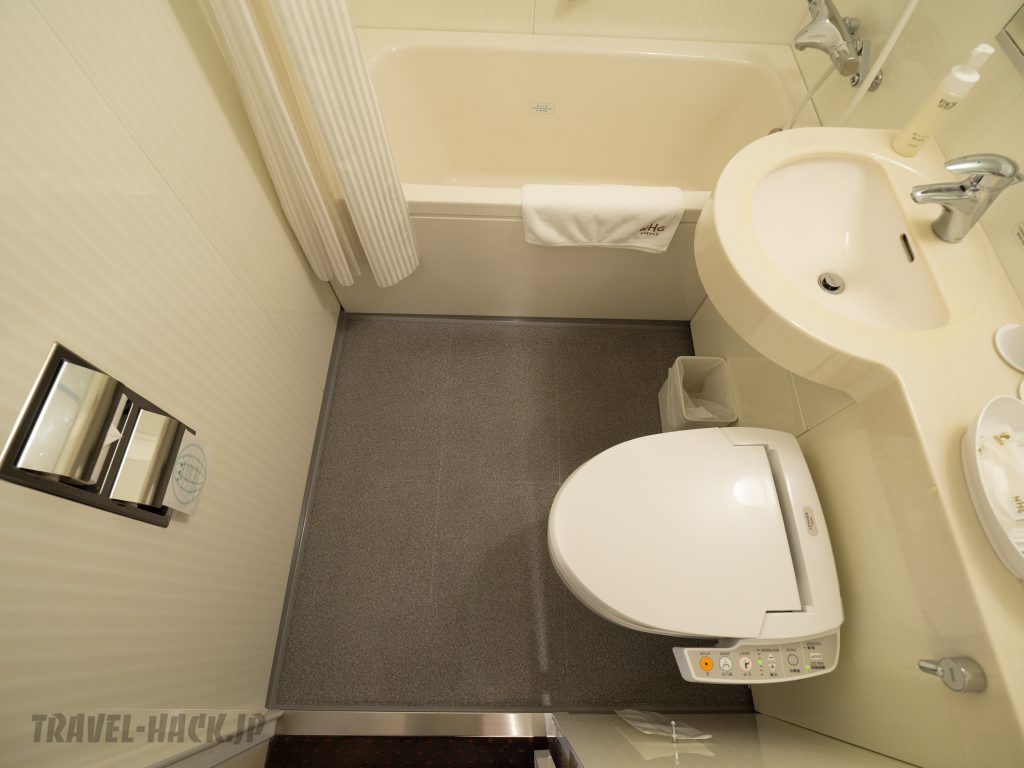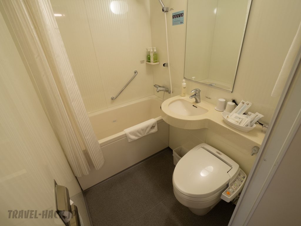 見ての通り、ワンルームマンションのような狭いユニットタイプではなく、トイレ前にスペースがそれなりにあります。最近のビジネスホテルのユニットバスの広さで不満は得にありませんでした。
