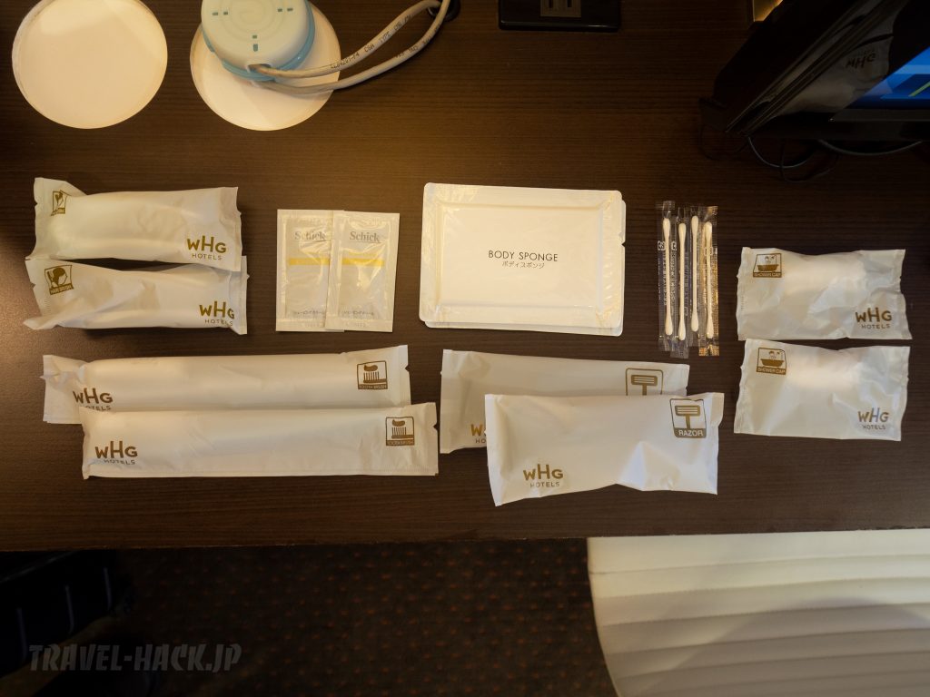 アメニティは歯ブラシ、シャワーキャップ、ひげそり、シェービングクリーム、ボディスポンジ、綿棒。