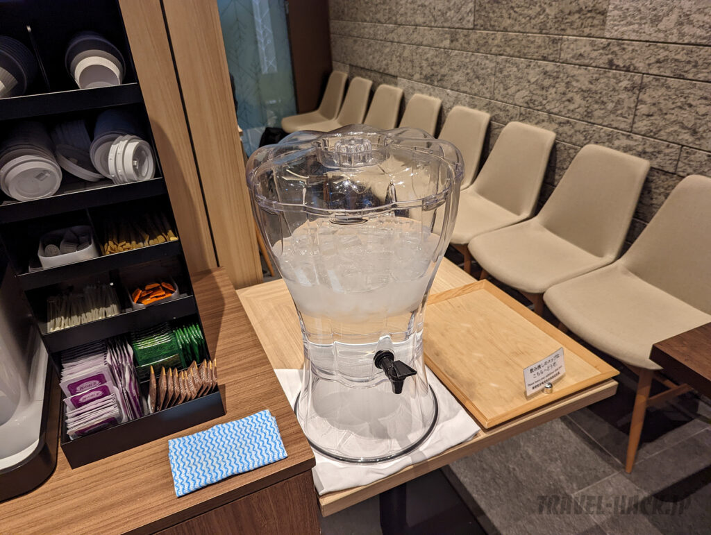 • ラウンジに無料のコーヒーマシンやお茶などが置かれている