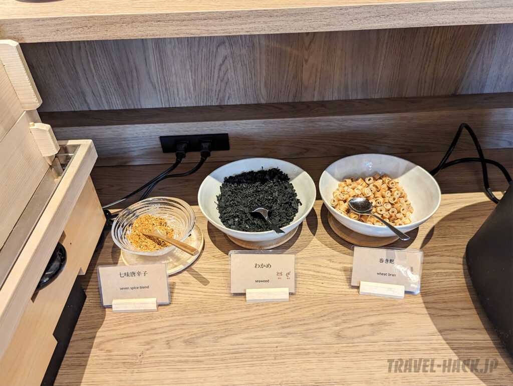 味噌汁のトッピング(七味唐辛子、わかめ、巻き麩)