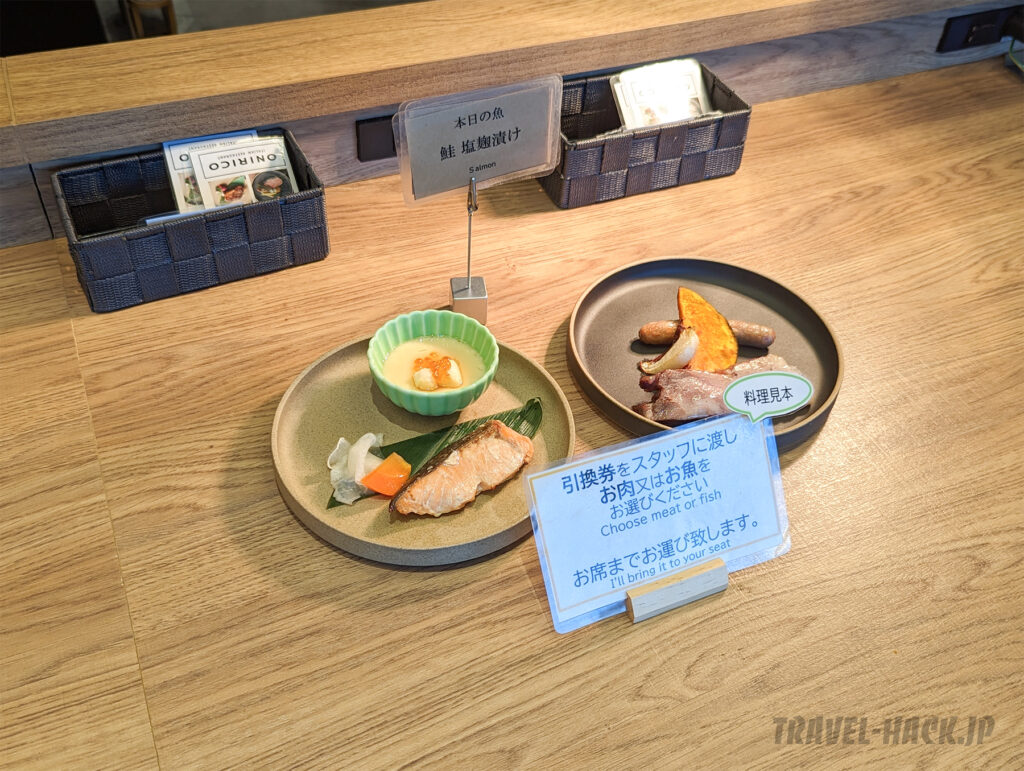 朝食会場に入る時に交換用のチケットがもらえます。このチケットでどちらか1品が選べる形です。