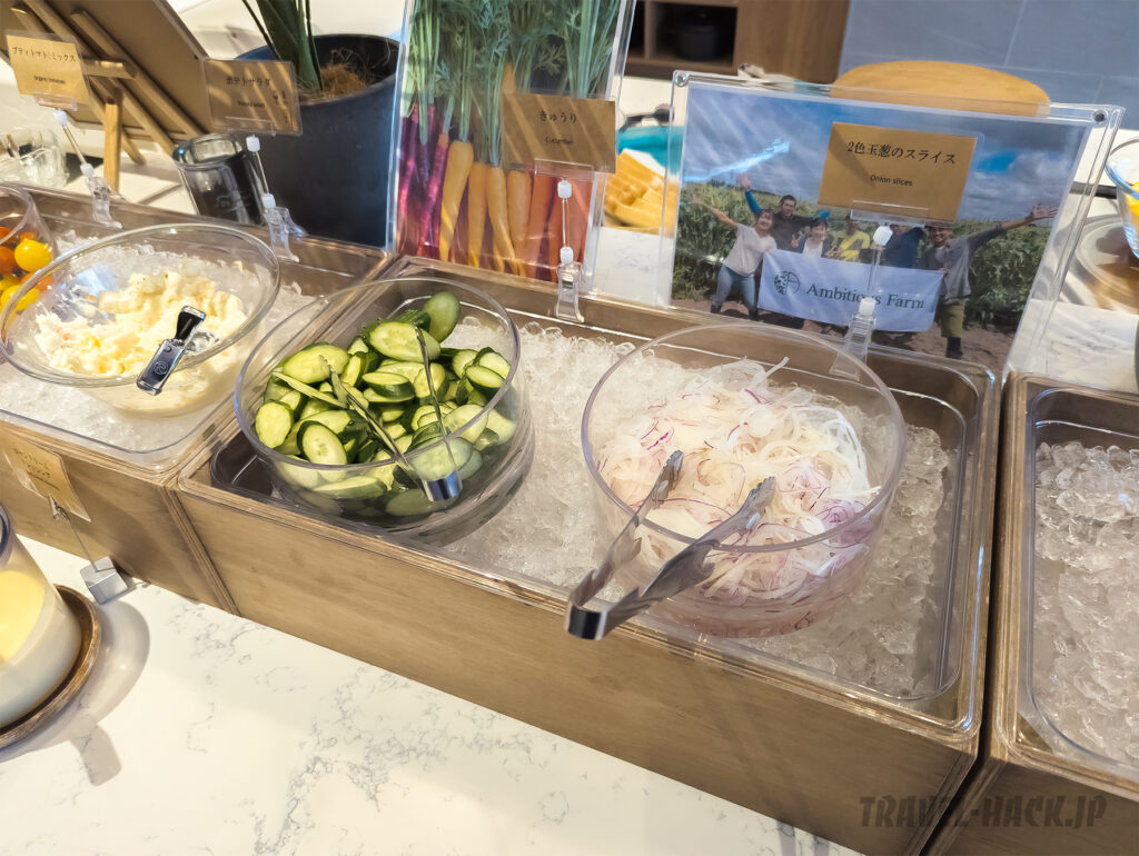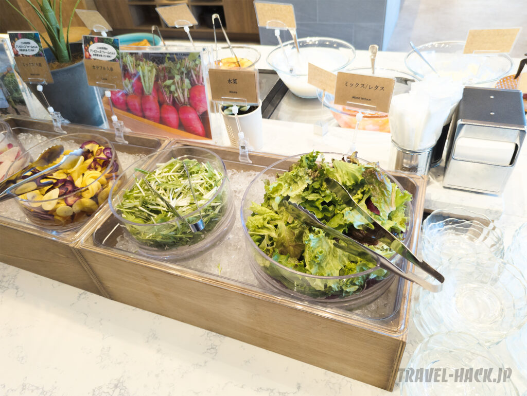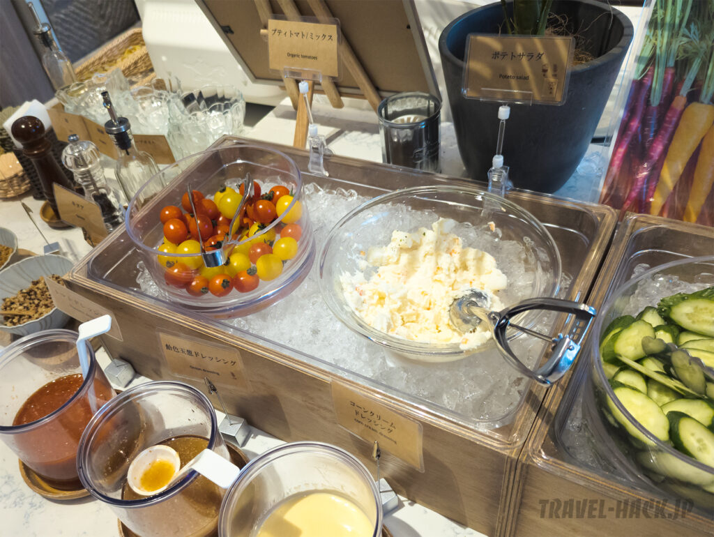 サラダの具材は見た目も良いし、種類もいい感じです。また、ドレッシングもトマトドレッシング、飴色玉ねぎドレッシング、コーンクリームドレッシングの3種類ですが、トマトとコーンクリームは結構珍しい印象です