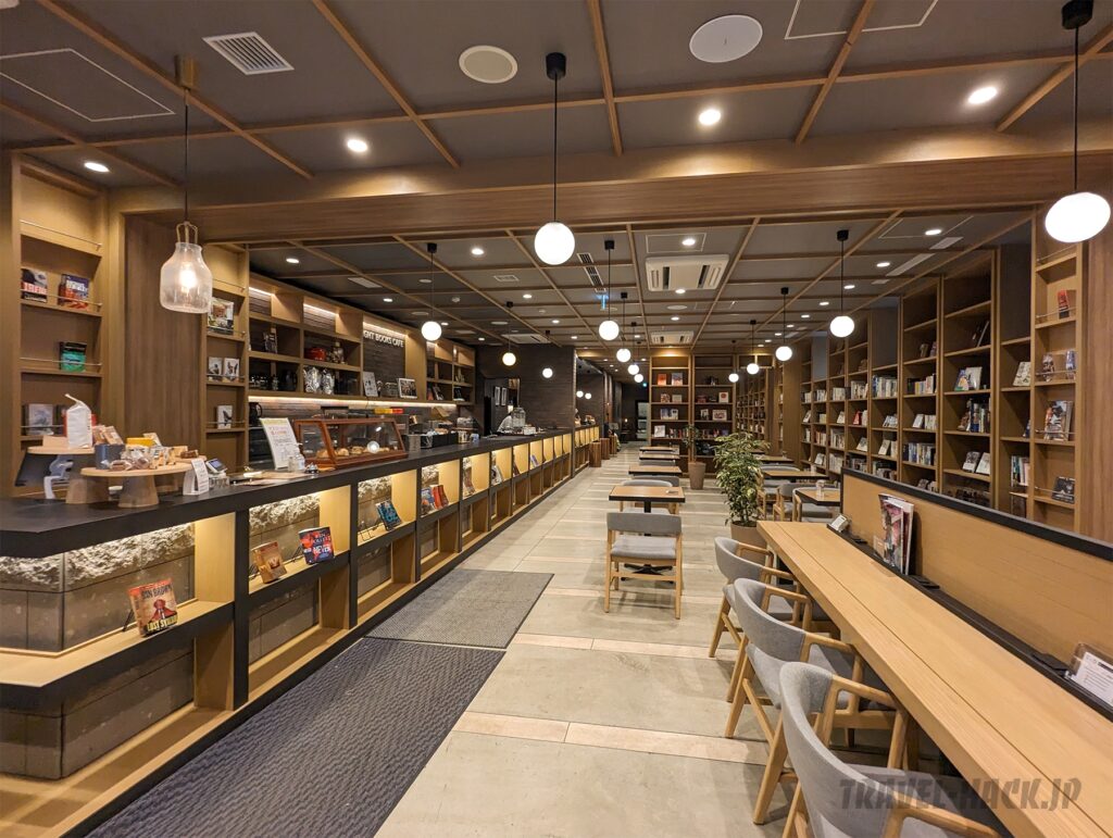 ランプライトブックスホテル札幌の1階はカフェとして24時間営業しており、館内に入ると手前にカフェスペース、奥側にホテルフロントがあります。