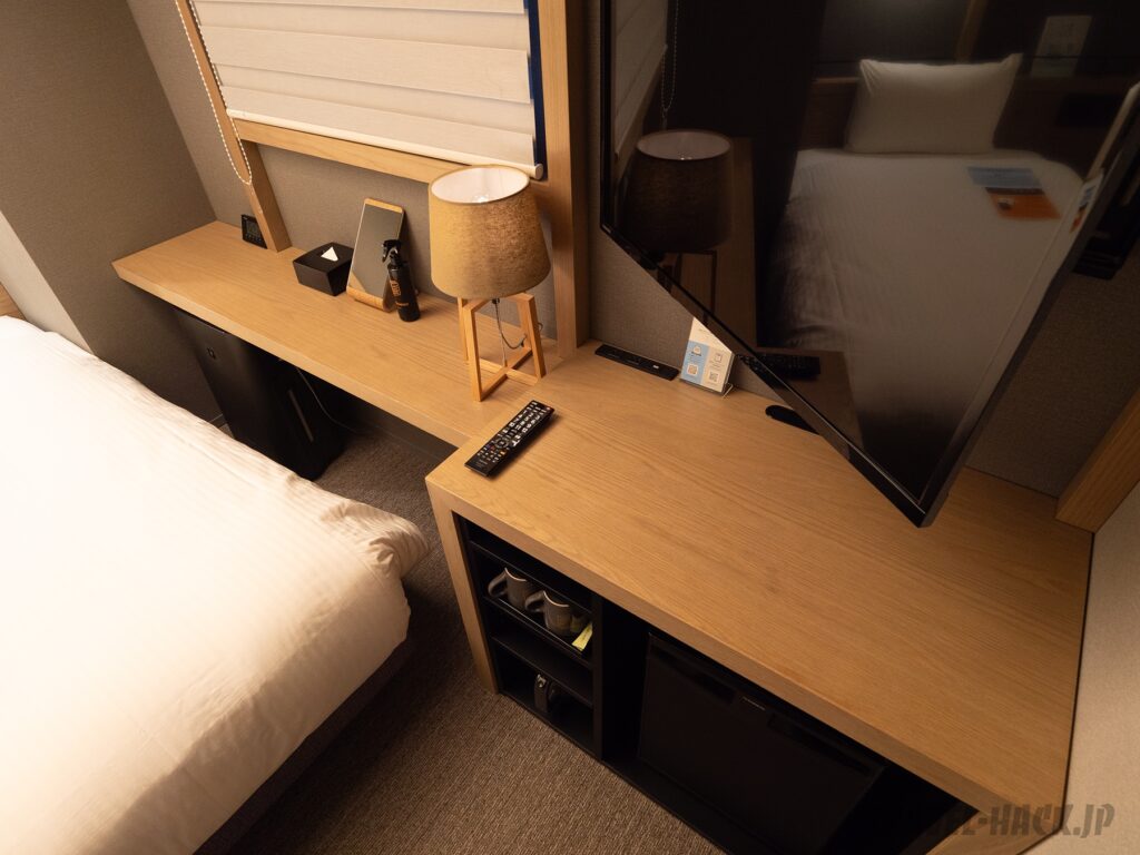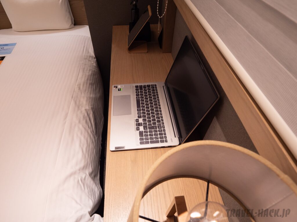 ビジネスホテルで15㎡前後だと、それなりにスペースもあって比較的快適に過ごせる空きスペースがあるところもあったりしますが、このスタンダードツインの空きスペースは本当に限定的です。ただ、使いやすいレイアウトで機能面でも工夫している印象でした。