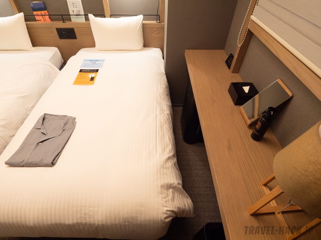 ランプライトブックスホテル札幌の「スタンダードツイン」は、15㎡の客室に洗い場付きバスルームを備えており、コンパクトながらも使いやすいレイアウトな客室でした。