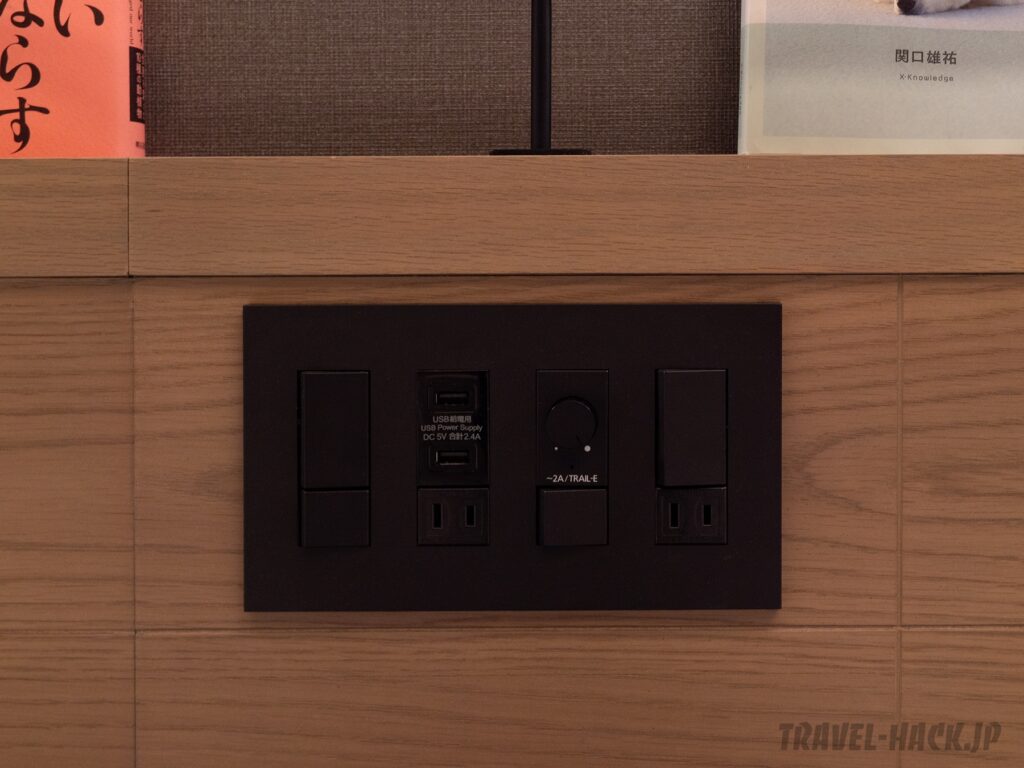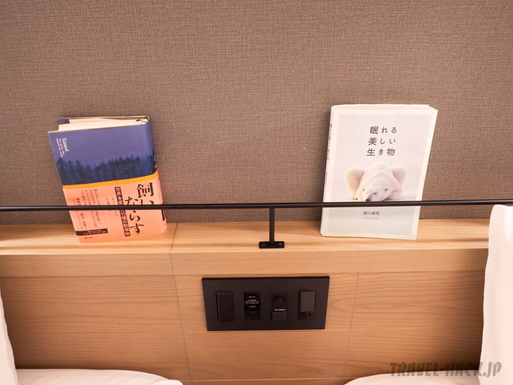 コンセントが「本」ということもあり、ヘッドボード上に本が置かれていました。また、カフェスペースにある本を客室内に持ち込むことも可能です(2冊まで/フロントで手続き必要)。