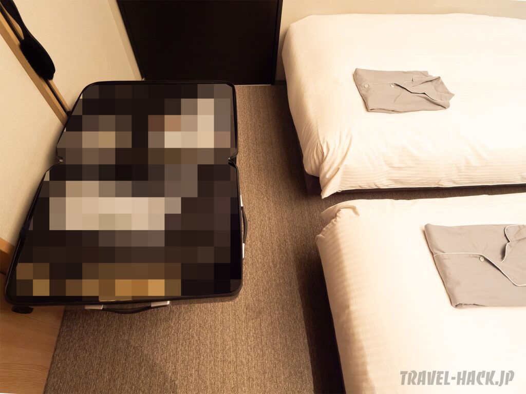 約70Lのスーツケースは狭いながら(ドアを開けると多少はあたる)も広げるスペースを確保することはできました。ドアを開く時などは干渉しますが、それでもこの広さの客室で広げられるのは良かったです。