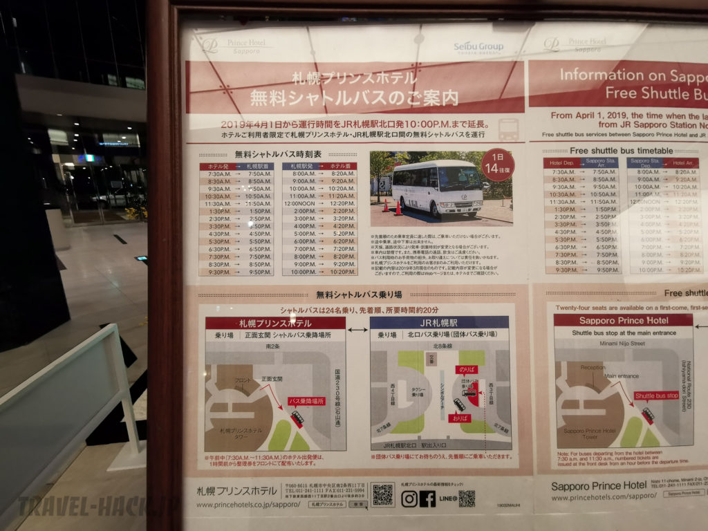 ホテルと札幌駅の間を無料のシャトルバスが運行されています。シャトルバスは1時間に1本ぐらいの間隔で運行されています。
