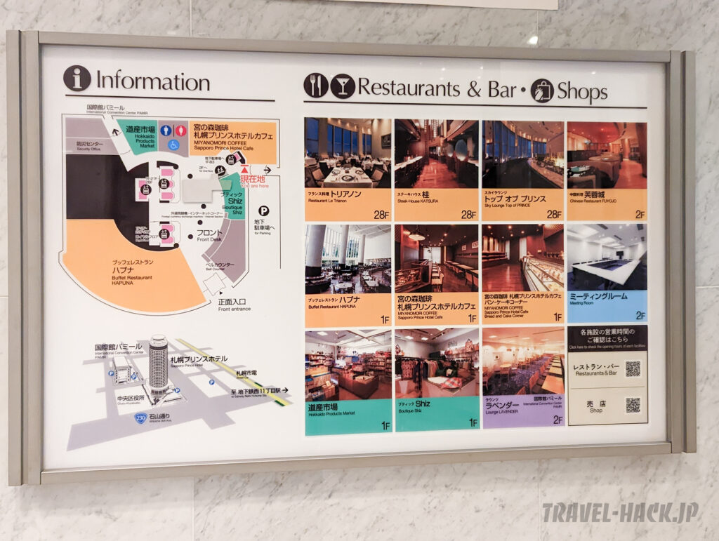 札幌プリンスホテルはレストランやバー、お土産屋、ブティック、カフェなどがホテルに入居しています。
