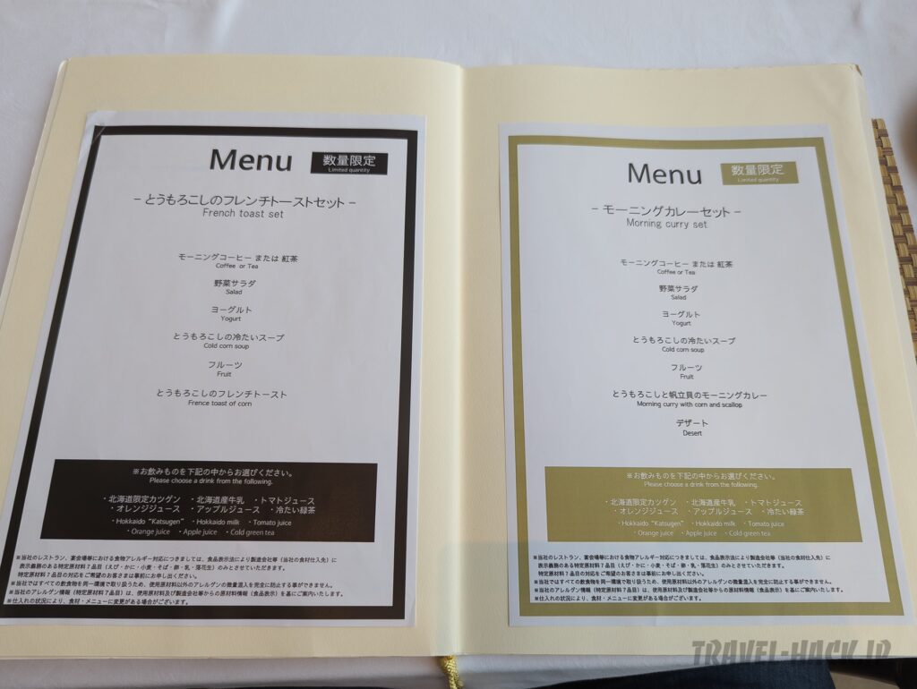 - 種類:和定食 / 洋定食 / 北の恵 モーニングカレーセット(数量限定) / 道産とうもろこしのフレンチトーストセット(数量限定)