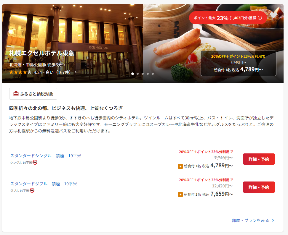 朝食付きでも最安値7,680円となっており、かなり激安レベル。前述した通り、札幌エクセルホテル東急は朝食がおすすめなホテルですが、スタンダードツイン以上の部屋は30㎡以上となっています。