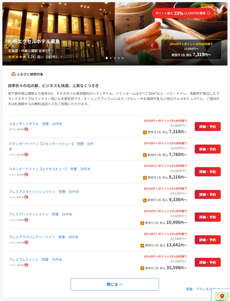 Yahoo!トラベルにて、20%オフ+ポイント23%となっており、他のOTA(楽天トラベルやじゃらんなど)と比べてもかなり安い印象です。