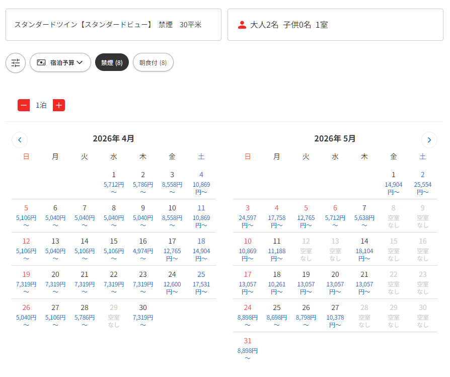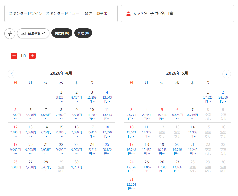 1名で素泊まり5,451円~、朝食付き7,107円~となっています。