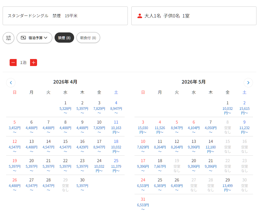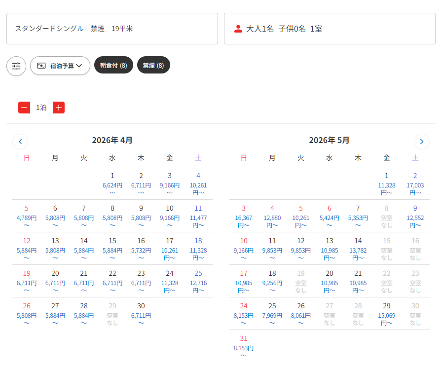 1名の場合はスタンダードシングルで4月が激安設定になっています。