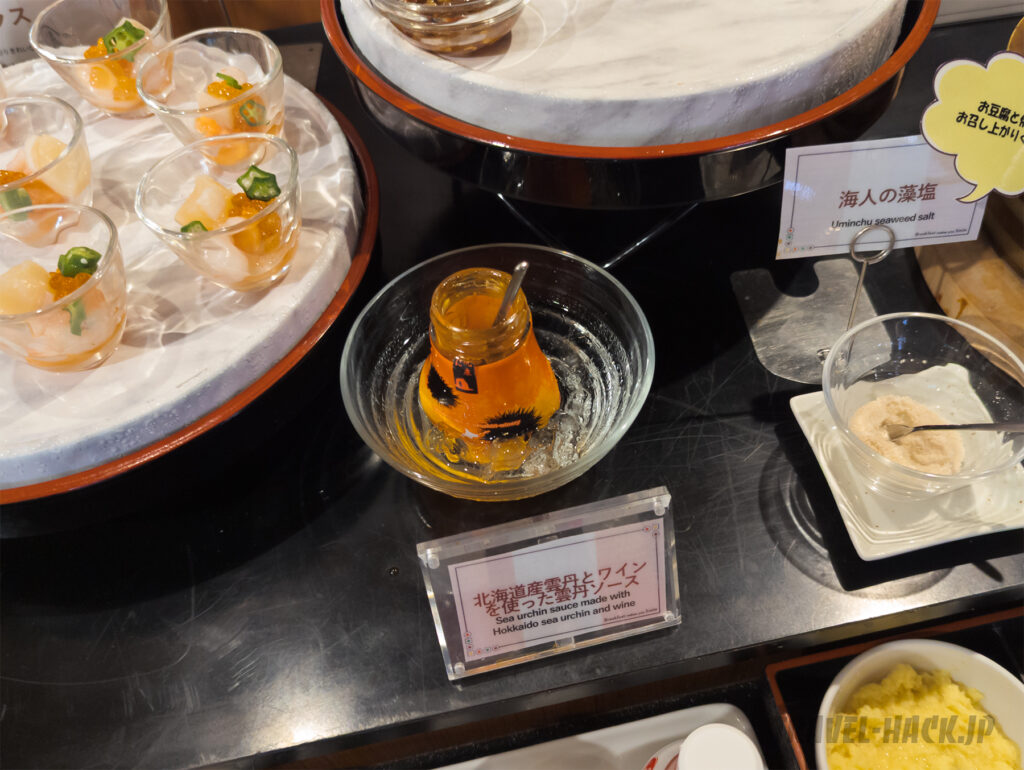 また「北海道産雲丹とワインを使った雲丹ソース」を海鮮グラスに入れて食べたりしました。雲丹ソースがあるのは珍しいですね。同系列の札幌 東急REIホテルの朝食でも同じように雲丹ソースがあります。