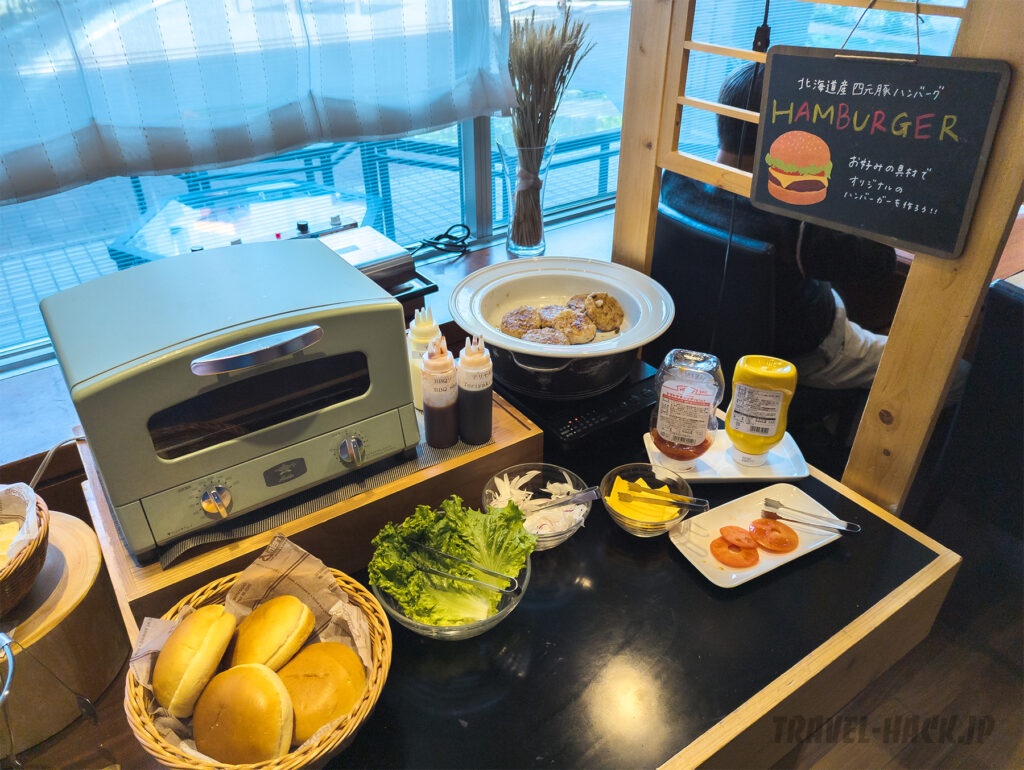 北海道産四元豚ハンバーグを使ったハンバーガーが作れます。ただ、バンズが結構大きくてボリュームあるハンバーガーが出来上がるので要注意。