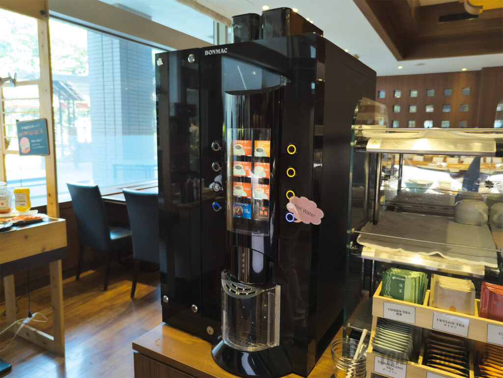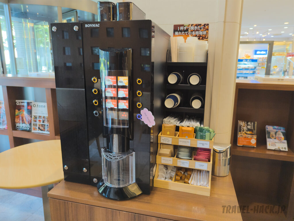 また、朝食会場を出たところにもコーヒーマシンがあり、こちらには持ち帰り用のカップが置かれていました。