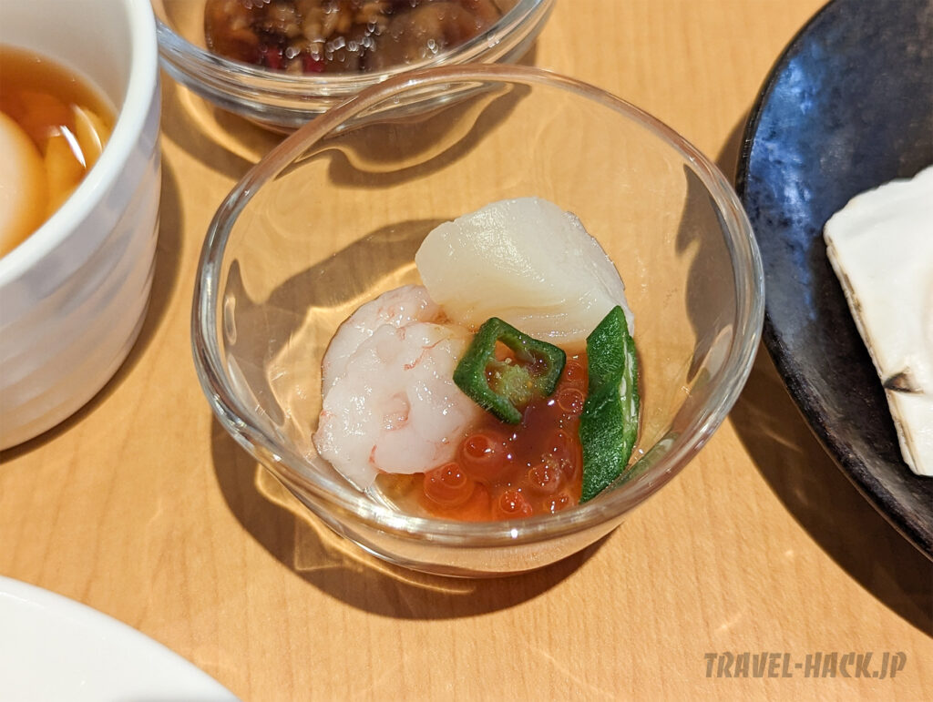 また、この「ミニ海鮮グラス」も目玉かなという印象です。ご飯にかけたり、そのまま食べたり、スパークリングワインのお供にもよいかも!
