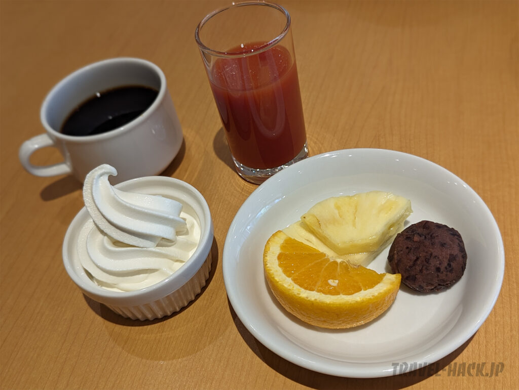 フルーツは4種類あり、デザートは牛乳プリンやおはぎ、ソフトクリームと、札幌では少なめのラインナップでした。