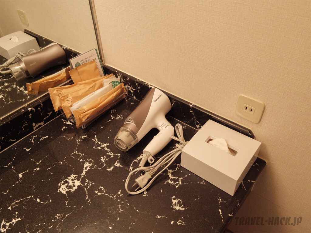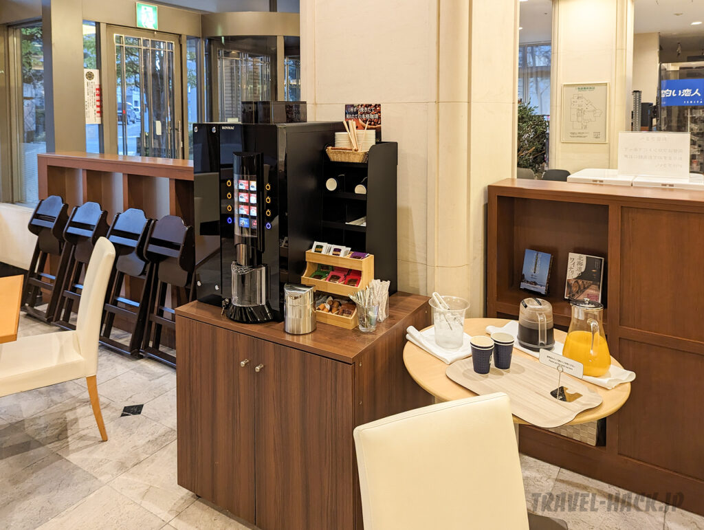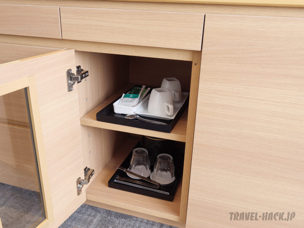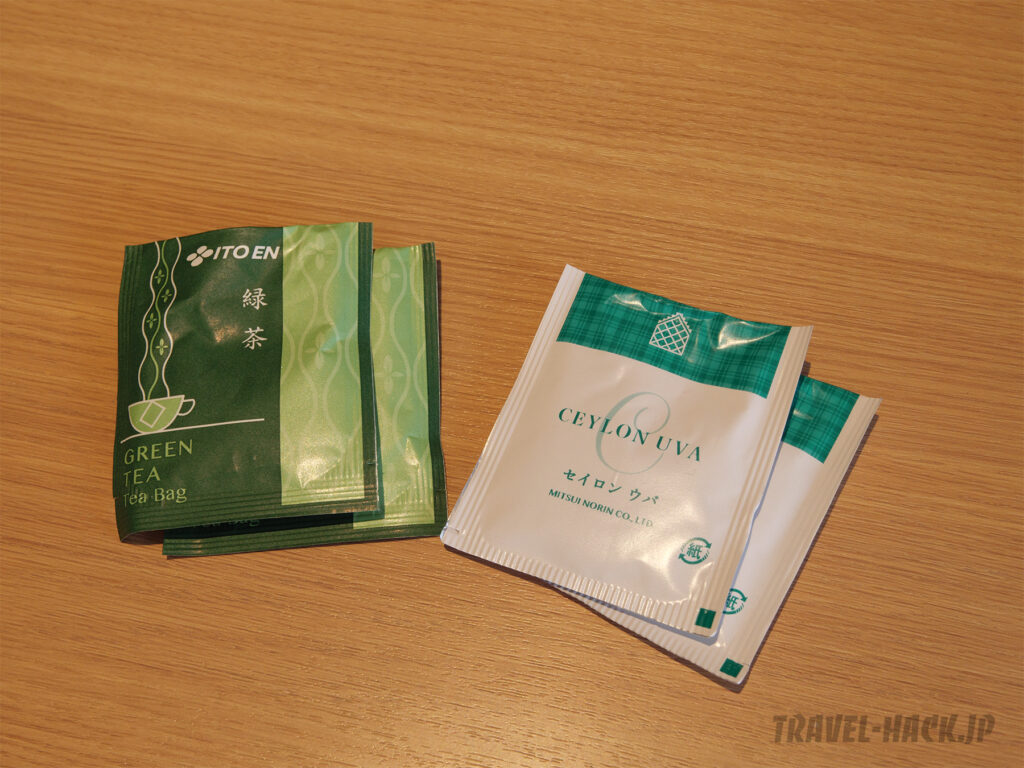 ティーアメニティは煎茶と紅茶のみ。コーヒーはありません。 ただ、無料で利用できるコーヒーマシンやお茶類、ソフトドリンクをラウンジスペースにて開放しています。