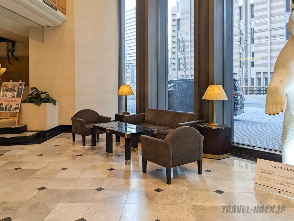札幌にあるシティホテル級のパブリックスペースを有しており、1階はかなり開放感があるため、観光での利用もおすすめです。ただ、なんとなく寂れた印象が残る館内でした(立地もあり、パブリックスペースにはスタッフの数の方が多い時がほとんど…)。