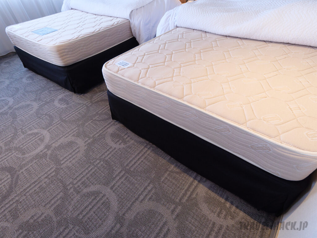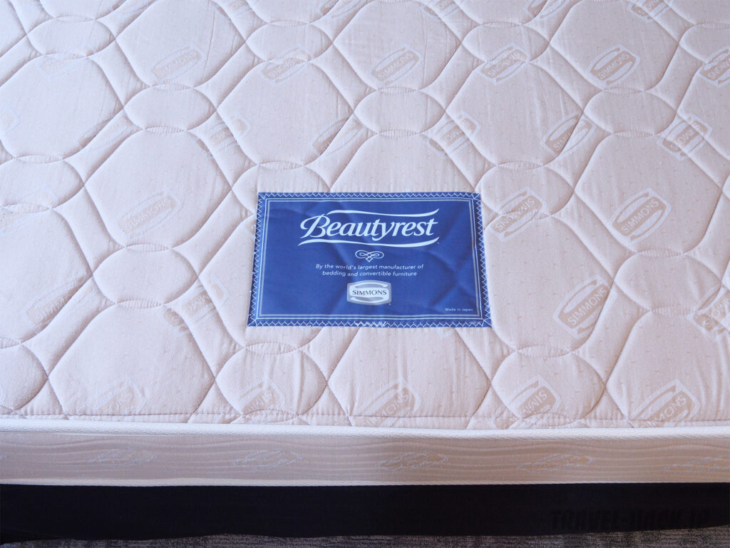 枕は綿タイプとウレタンタイプの2種類がありました。ベッドのマットレスはシモンズを採用。ピロートップはないですが、寝心地も良いです。また、122cm幅なのでかなり広々としていました。
