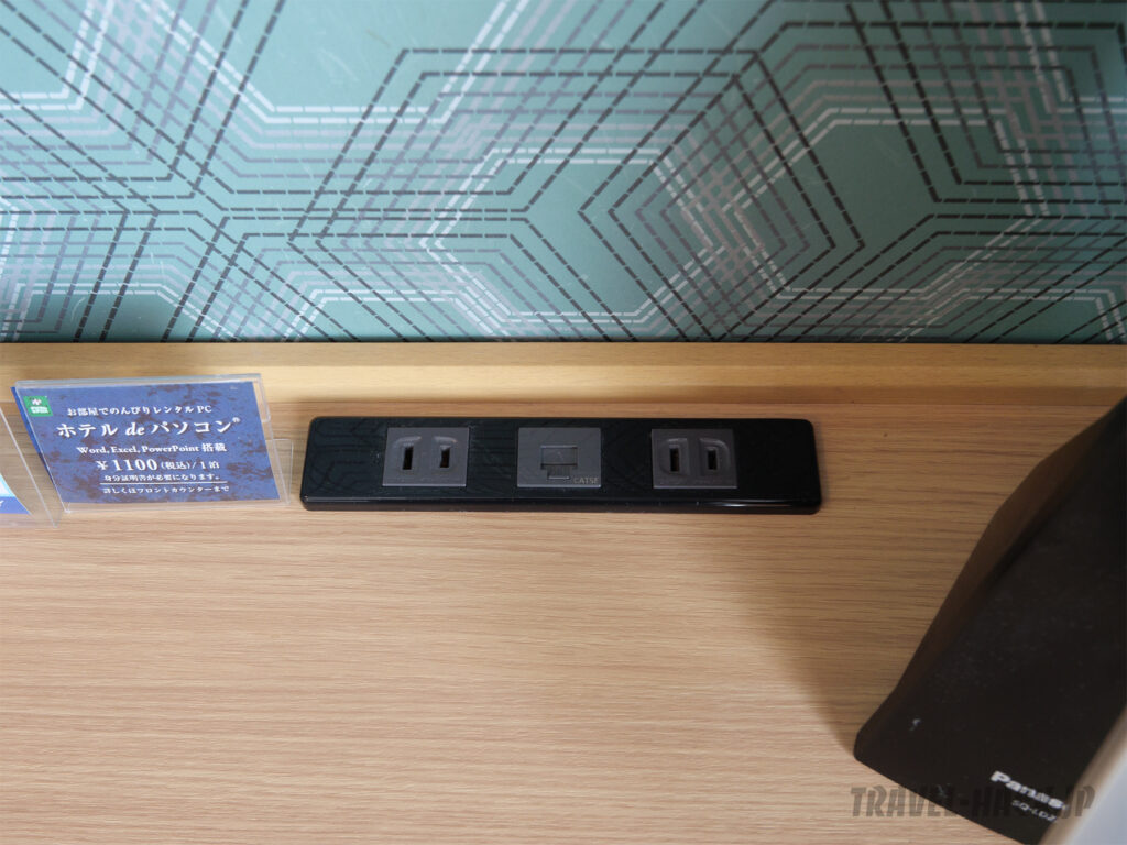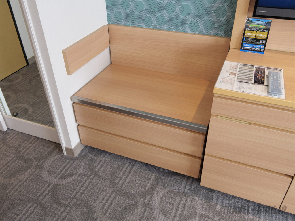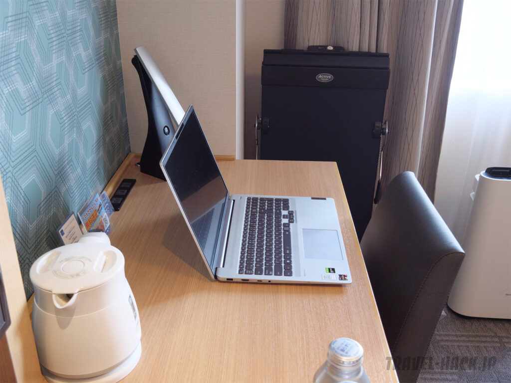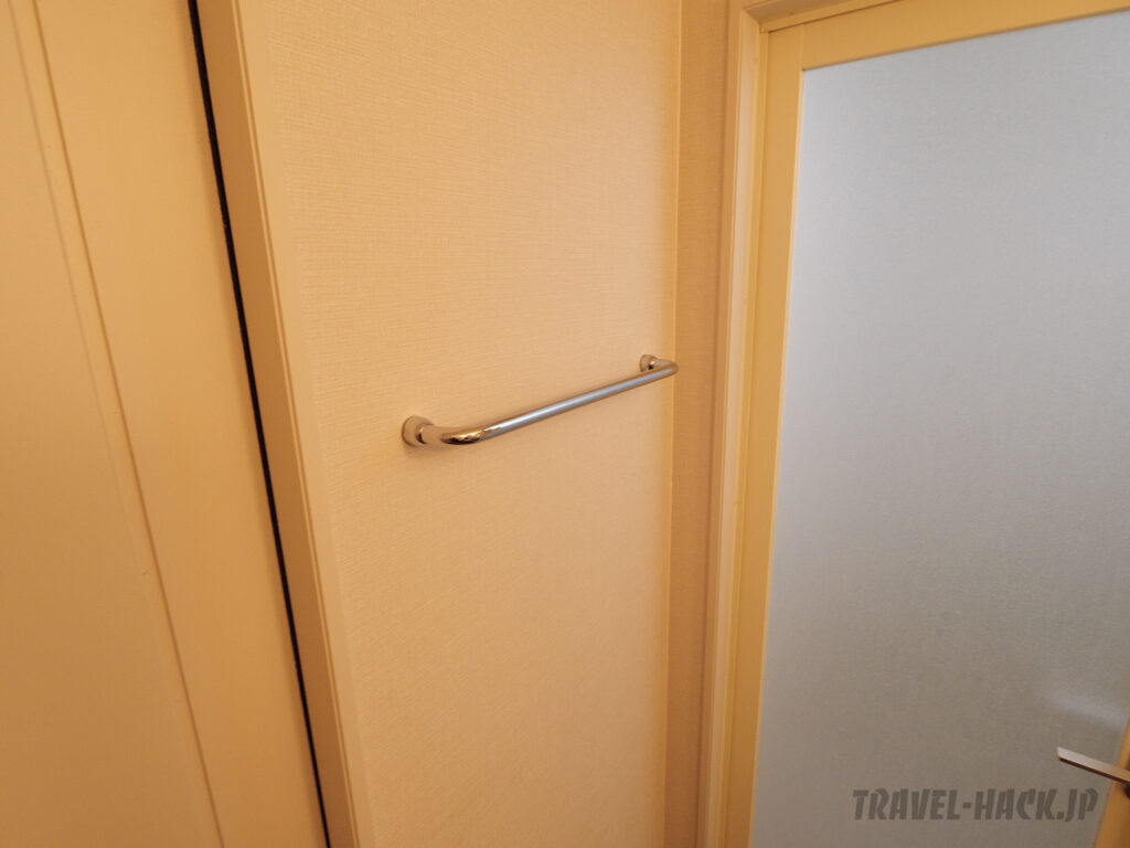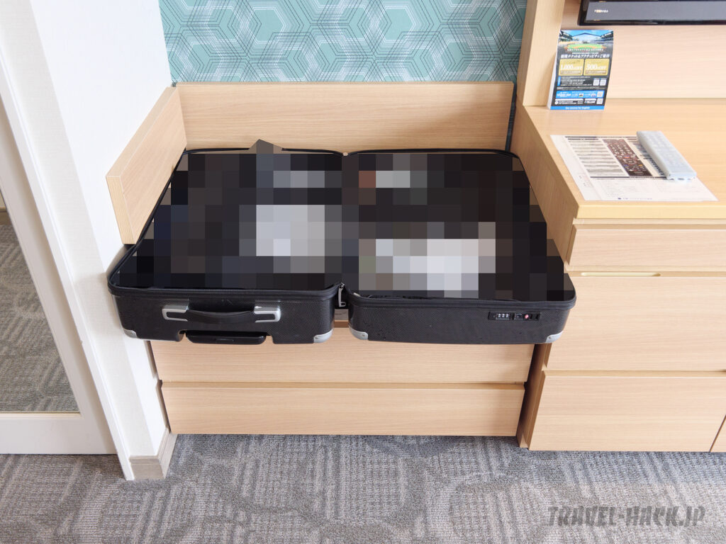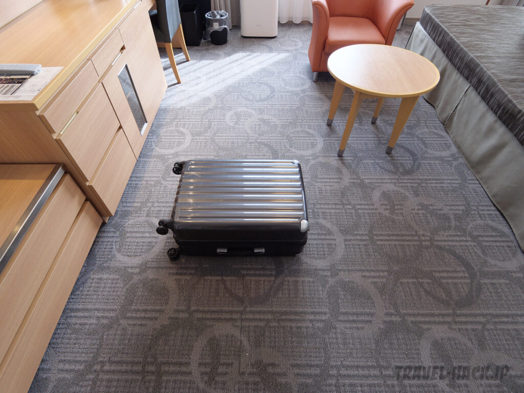 部屋は広いのでバゲージラック以外にも空きスペースはかなりあり、100L以上のスーツケースも邪魔にならないように置けるスペースは余裕で確保できるぐらいです。
