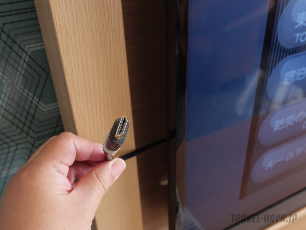 テレビは東芝製で50インチほどの大きさ。かなり大きいです。壁掛けスタイルで角度の調整などはできません。また、HDMI端子が延長コードで使えるようになっていますが、先端はオス端子になっている点に注意。FireStickなどを繋げる場合はメス端子が必要なので、変換器などを持っていくようにしましょう。