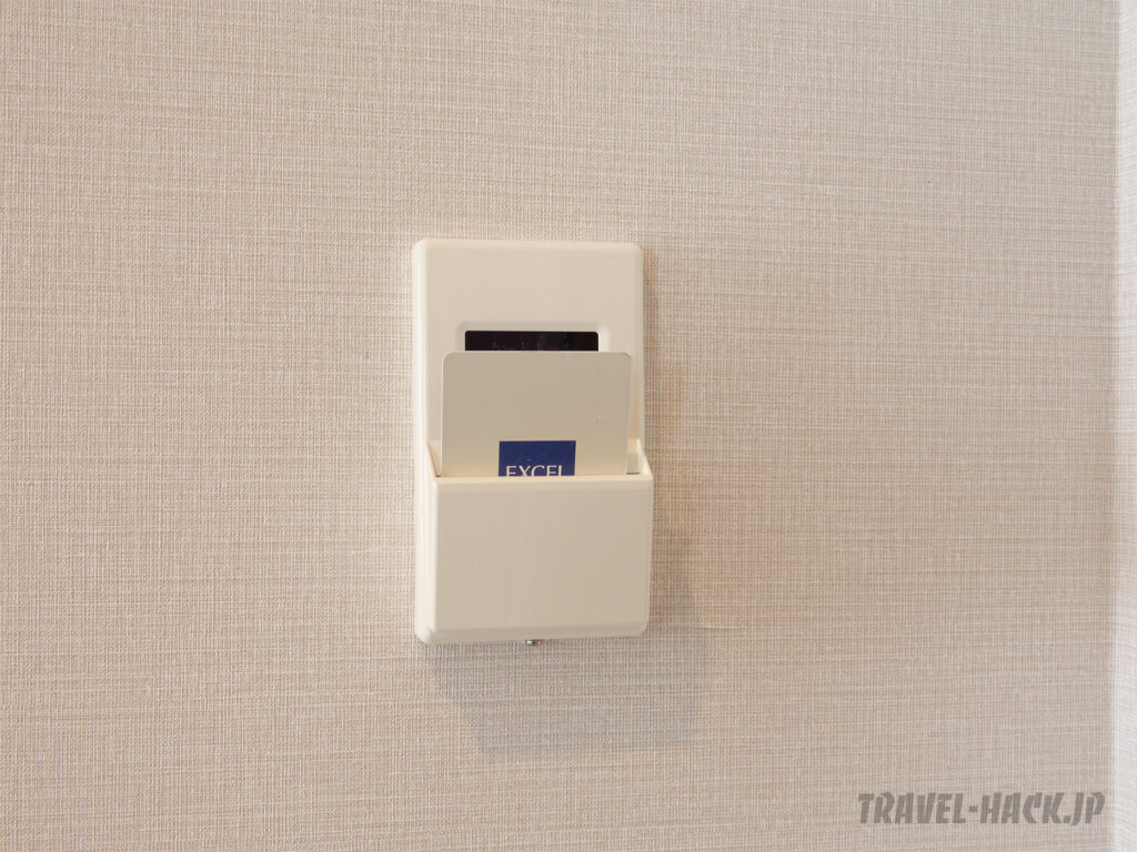 カードキーをカードホルダーに入れると、電気などがONになるタイプです。キーカードを抜くと、電気や空調は止まりますが、テレビは利用できます。