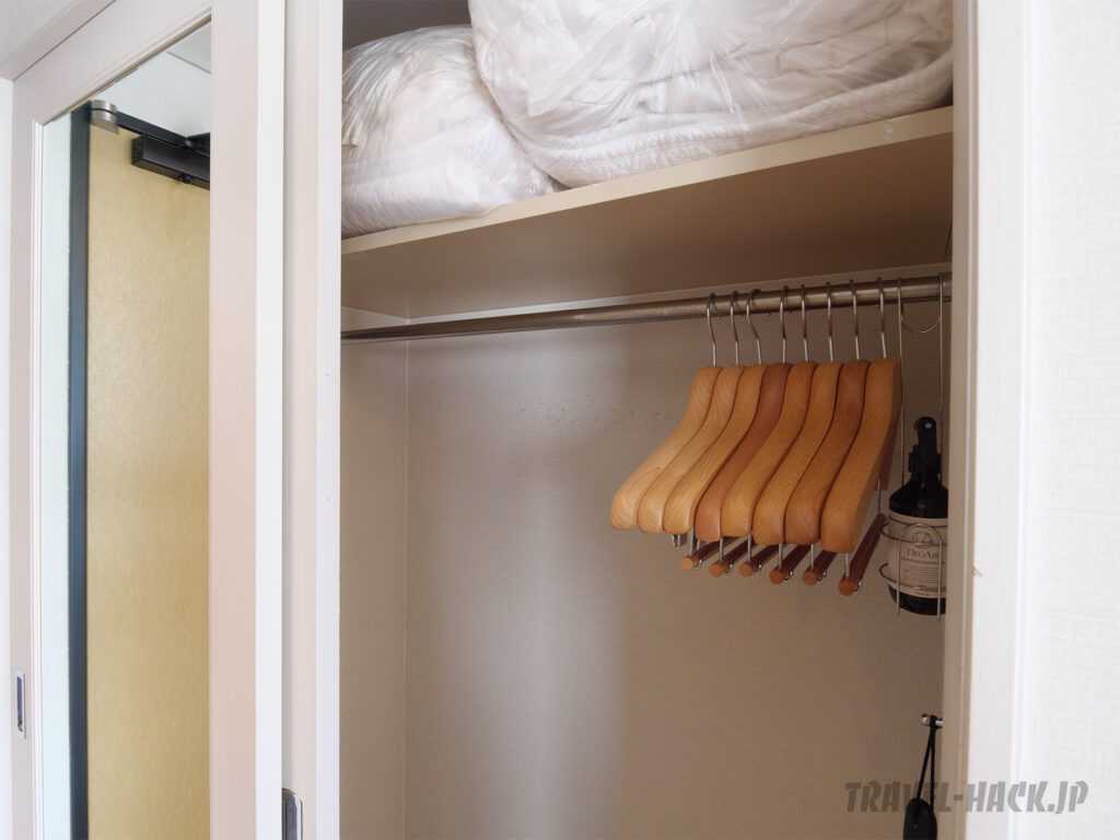 ハンガーは全部で8本あり、クローゼットは大きすぎることはないですが、冬場にダウンやコートを掛けてもかさばらないぐらいの広さはあり使いやすいです。