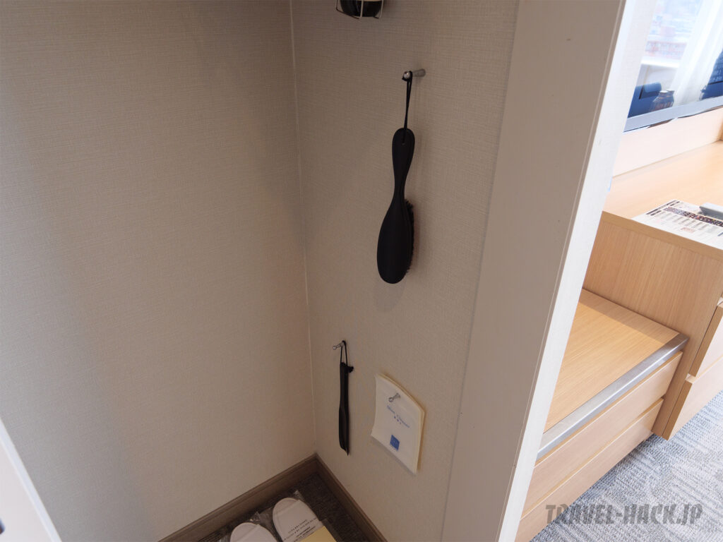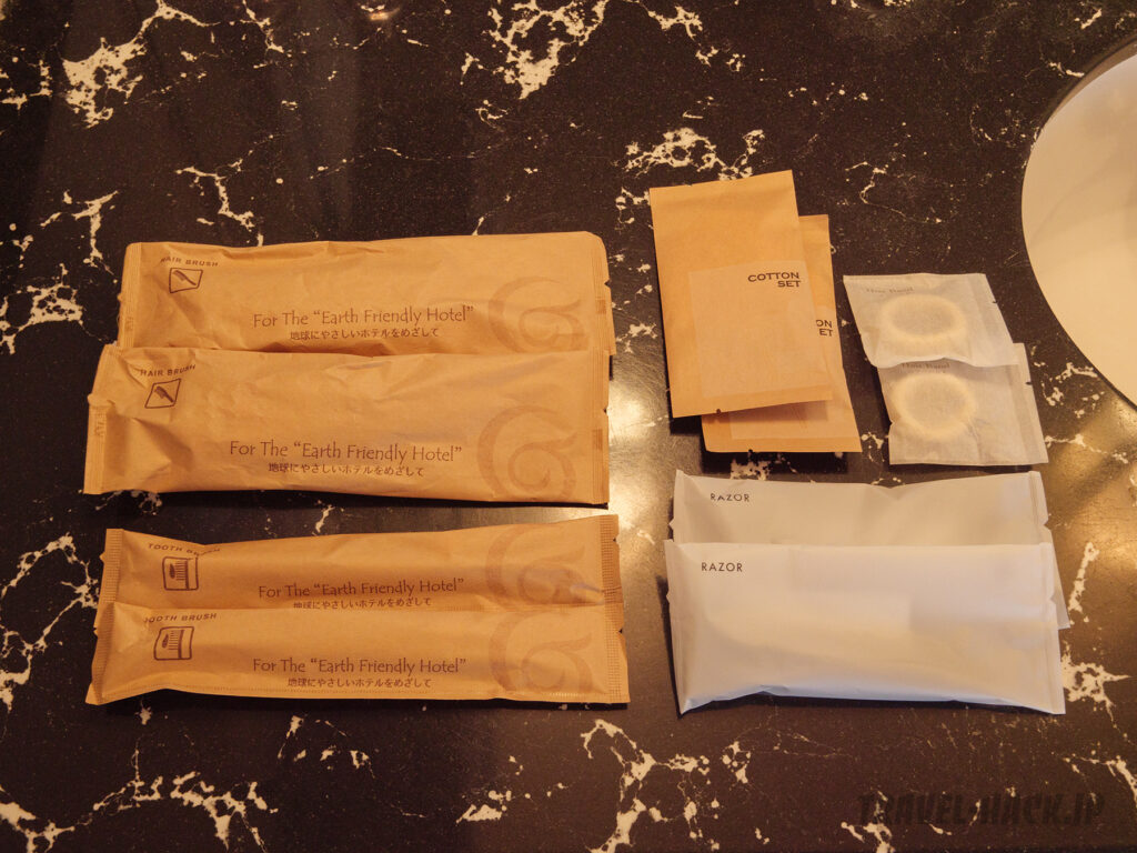 アメニティはヘアブラシ、歯ブラシ、カミソリ、コットンセット、ヘアゴムが置いてありました。