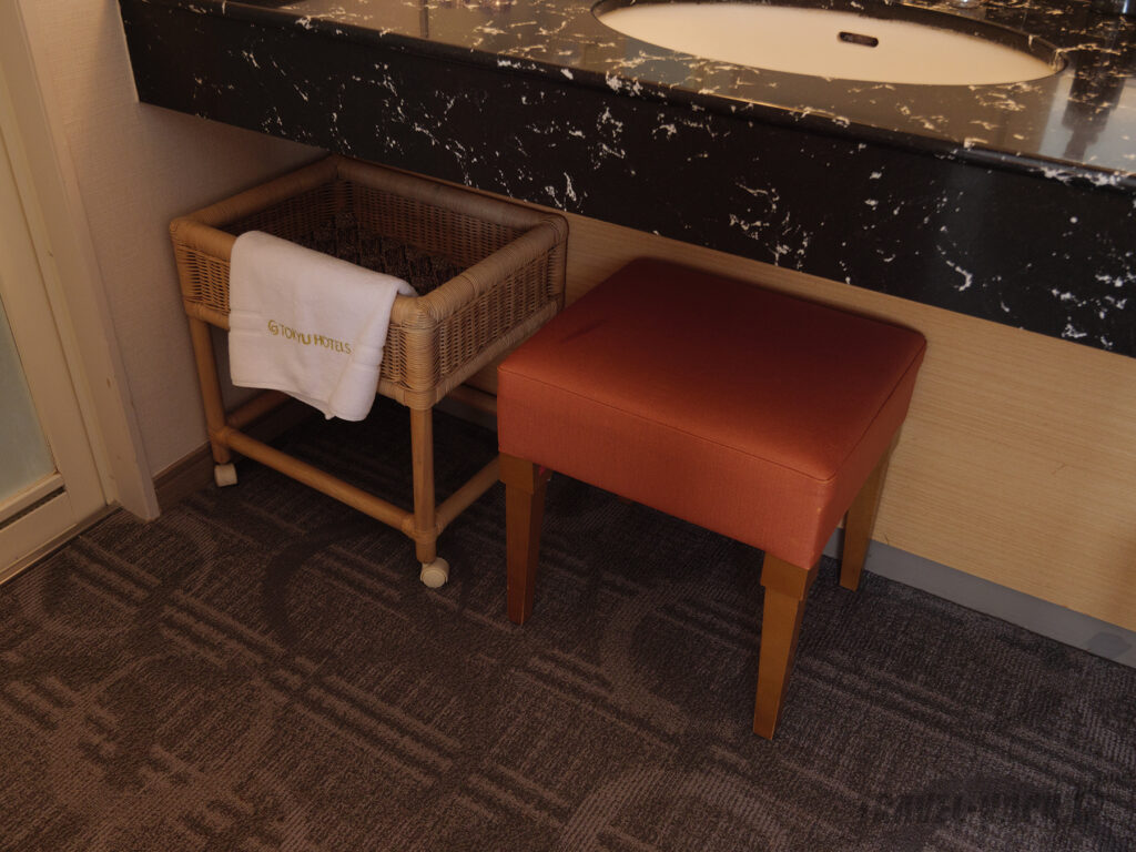洗面台の下には椅子と洗濯物入れがあり、使いやすいです。