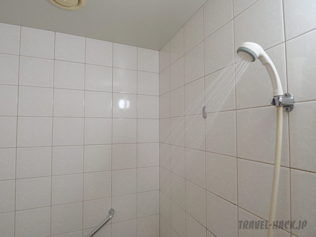 シャワーの水圧はやや弱め〜普通という印象。やや弱いというよりも、シャワーヘッドの問題でシャワーの中心部分はあまり水が出ないタイプを採用しているため、そのように感じてしまうのかな?という印象でした(蛇口からはかなり良い水量でした)。