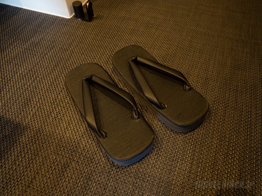 また、下駄の場合は足袋が付いてくるようですが、上記写真のスリッパの場合、客室内に足袋は付いてきませんでした。どのようにして運用しているのか不明です….。